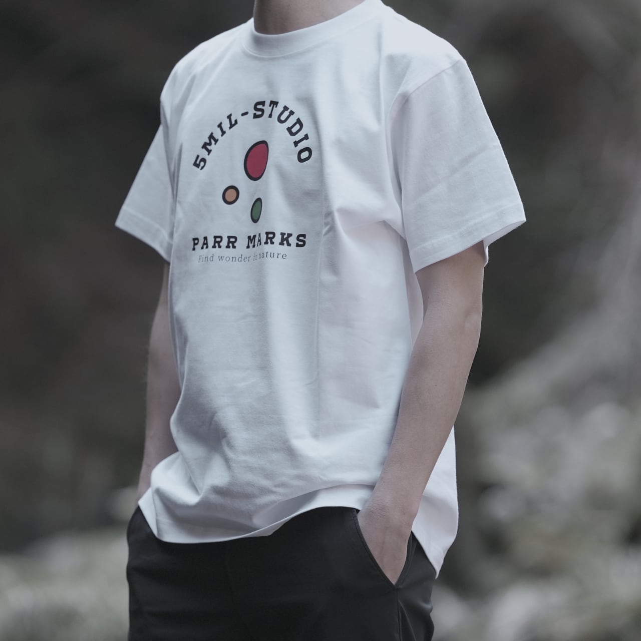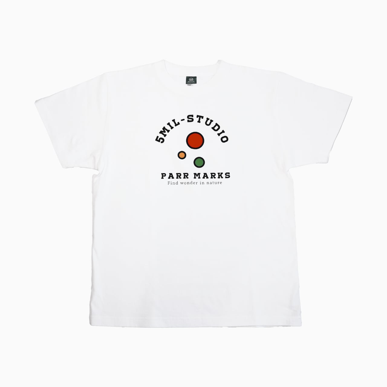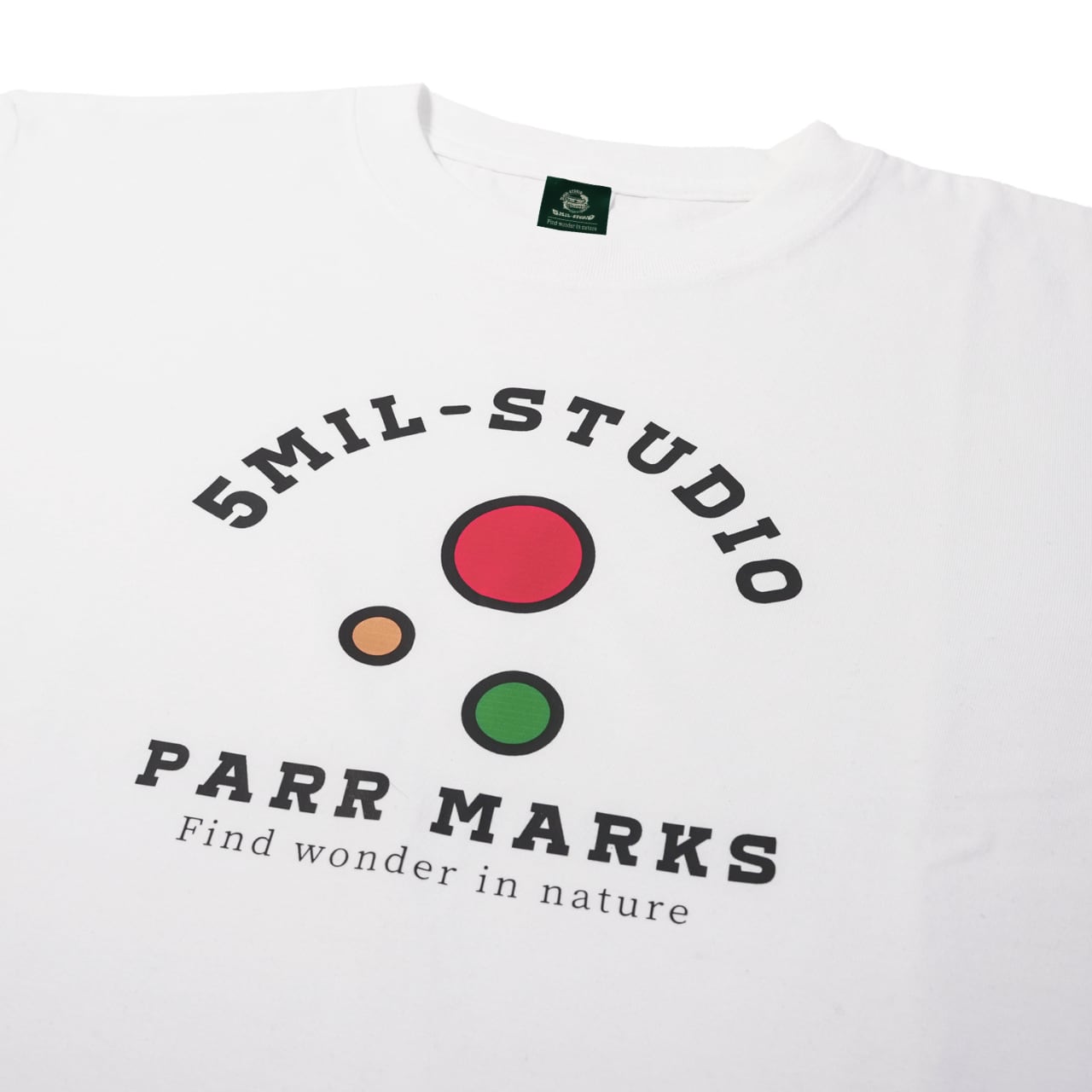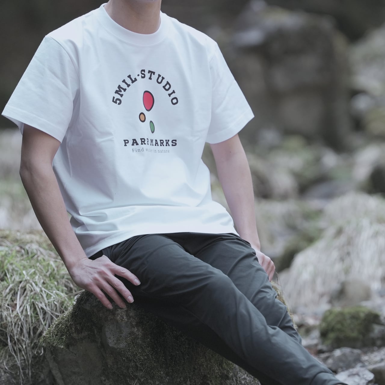 ブランドロゴを刺繍で仕上げています。プリントとは違う、糸ならではの立体感と質感が特徴です。襟元には5MIL-STUDIOオリジナルタグを縫い付けています。